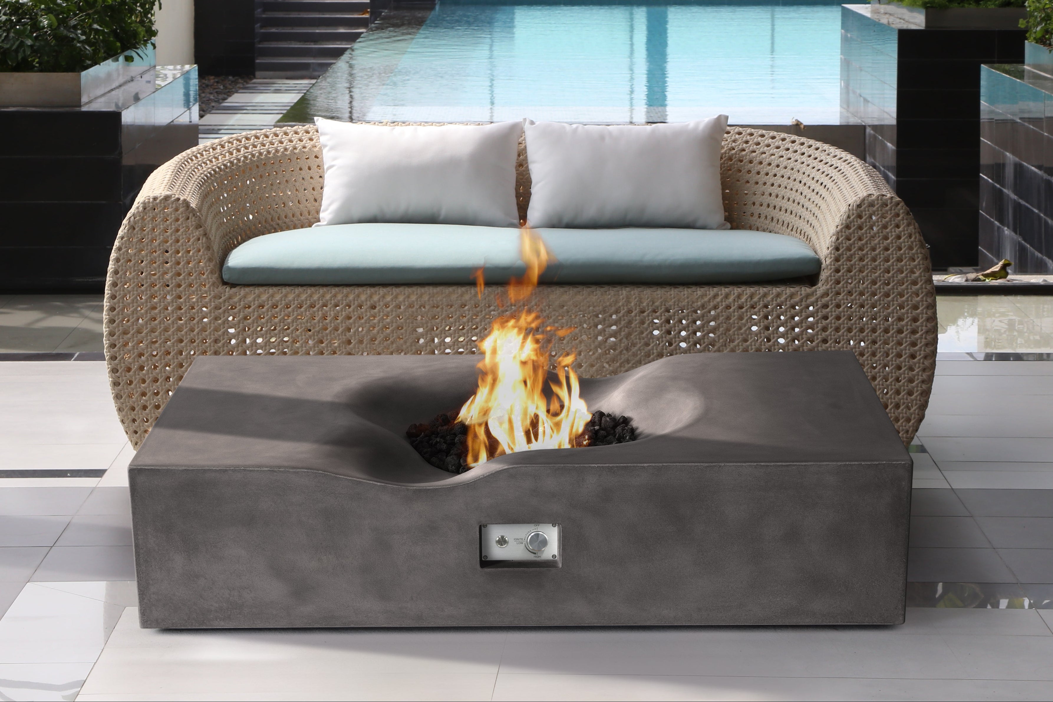 This extraordinary fire table showcases a unique and eye-catching design, making it a perfect centerpiece of your outdoor area. Its high-quality and high heat output at 65,000 BTUs burner system is designed to meet diverse needs with three ignition options: match lit, flame sense with spark or APPE (adaptive plug & play electronic). Our renovative electronic ignition enable multiple ways to control your fire pit including remote control, timer, wall switch, RFID or key. Available in two refined finishes: sealed concrete in two natural tones, or our exclusive polymer coating offered in 11 mid-century modern colors.